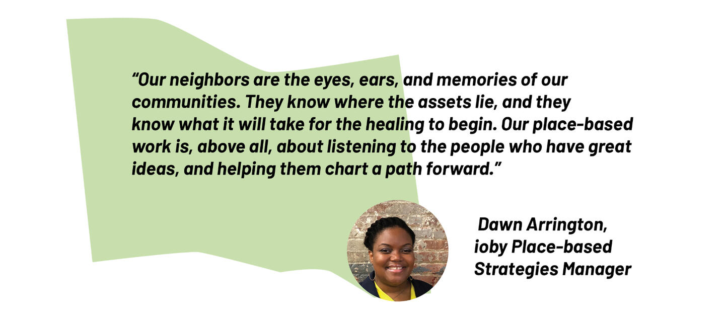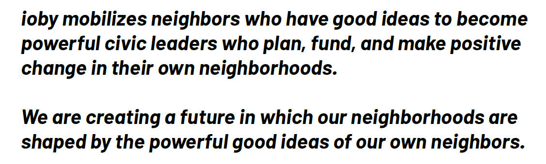 What does a better world look like? Is it safer streets? Racial justice? More beautiful neighborhoods with more places to play? Or is it the sense that the power to make a better world lies in our own hands and the hands of our neighbors?At ioby, everything we do—from the online fundraising tools we build to the way we work with local leaders to plan their fundraising campaigns—is rooted in our belief in the powerful good ideas of our own neighbors. Real, lasting, positive change at the community level can only be led by the people who are closest to the challenges and opportunities within their own communities.That’s why our work with local leaders is about so much more than raising money. It’s about building trust. It’s about building power. It’s about putting into action our belief that our communities, our democracy, and our world can be better—but only if we truly listen to each other and let our neighbors lead.
