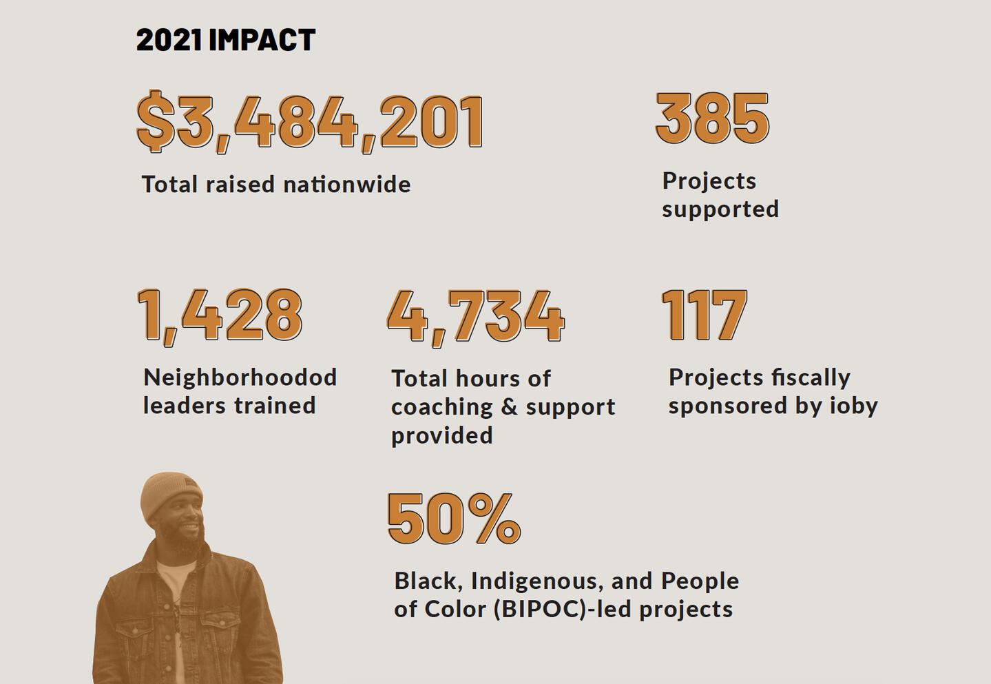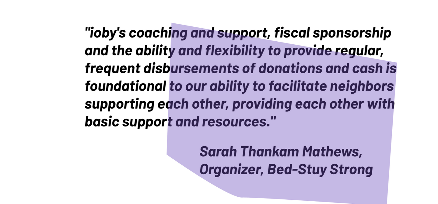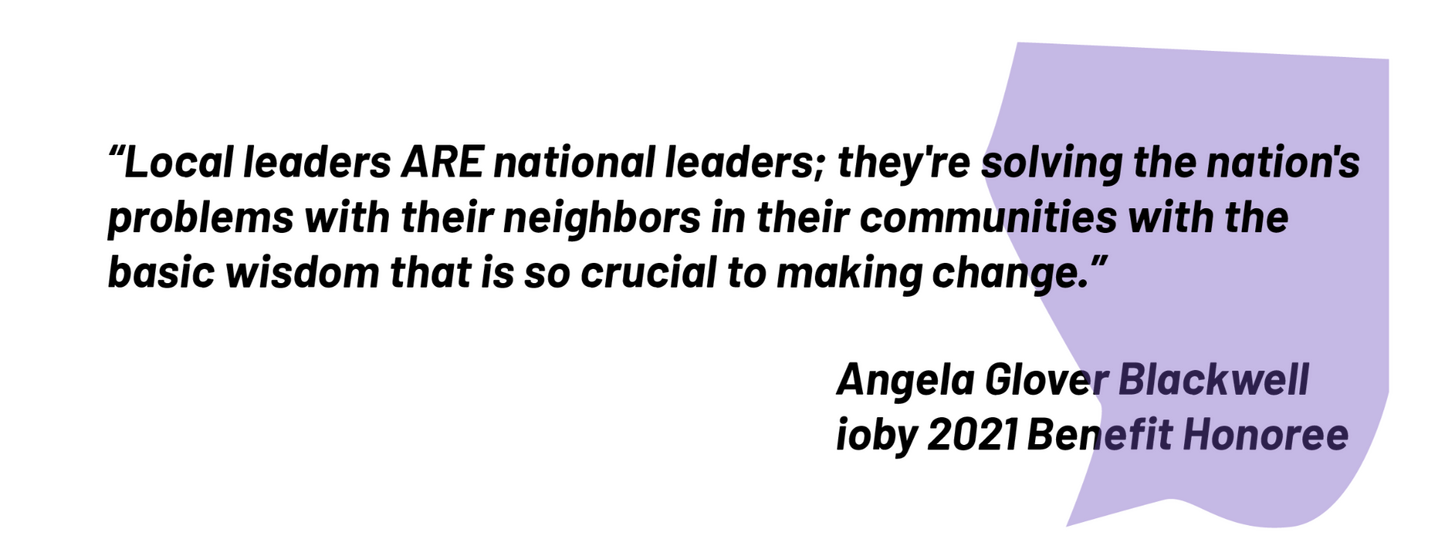 Dear Friend,The past two years have been tough. The COVID-19 pandemic, racialized violence, widening economic disparity, climate collapse, and the active dismantling of our democratic institutions have dominated our lives, with no clear end in sight.And yet, I am grateful to be able to work directly with our community of changemakers whose knowledge, passion, and drive results in real, positive change. These resident leaders are the reason ioby exists, and they are the center of our work. ioby could not do this work without our community of partners, donors, and supporters; thank you for your continued investment in our communities, and in our mission of resident-led change.In 2021, ioby supported 385 local projects to raise $3.5 million for real, tangible solutions to some of our most pressing challenges. In this Giving Report, I am excited to reflect some highlights from 2021, and share some of what’s next.I’m thrilled to announce that in 2022, we are migrating to a new ioby.org. ioby’s new platform, like everything we do, is rooted in deep listening and years of work with our communities, particularly BIPOC communities whose needs have often been overlooked. ioby believes that technology can never be value-neutral, so we continually strive to build ours toward equity. That’s why our racial justice work last year included launching a new Digital Inclusion Policy, rooted in our values, to guide our future decision making as an equity-focused intermediary. And this same kind of deep listening has shaped our fundraising coaching, tools, fiscal sponsorship, match programs, and the resources we offer.ioby’s work has always been about making it easier for residents to step into civic leadership. Taken together, even small-seeming local actions are the first steps toward repairing our tattered civic infrastructure. We have seen leaders in neighborhoods nationwide rise to the critical challenges of the past two years. And we truly believe these local leaders are best positioned to lead our way out of crisis, whether long-standing or sudden. It’s our job to support and follow their lead.With immense gratitude,