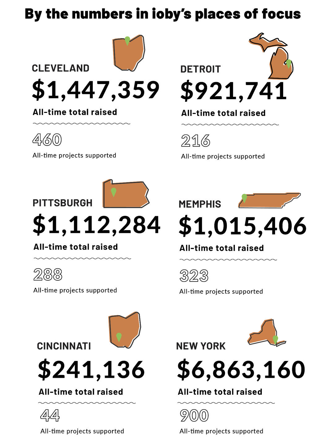 ioby also has deep partnerships in our places of focus: Cincinnati, Cleveland, Detroit, Memphis, New York, and Pittsburgh. In these places, we pursue place-based strategies to support resident-led change with an intentional focus on reaching neighborhoods with histories of racist-policies and disinvestment. This includes partnering with local organizations and agencies, implementing match programs, and providing on-the-ground support to residents from ioby Action Strategists—staff who work alongside these leaders to build lasting relationships of trust rooted in knowledge of place. This local, more-than-fundraising approach creates ripples within communities that can lead to transformational change, setting ioby apart.